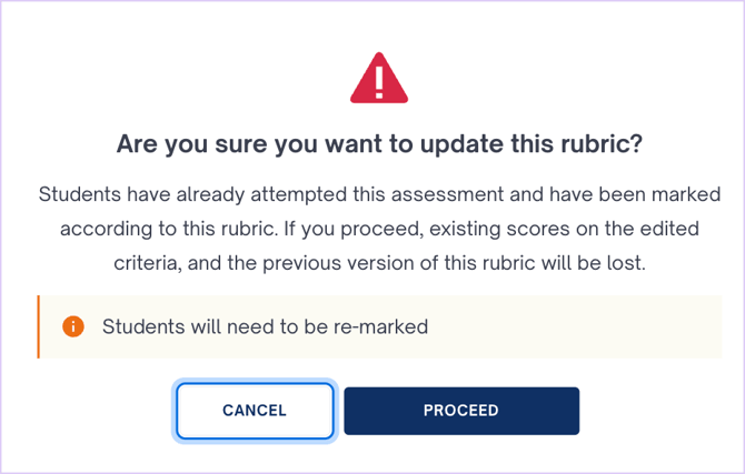 - Click ••• at the top right of the panel to find options to view or open the rubric in an expanded window. When you view the rubric while marking, you can click on the lock icon 🔒 next to the furthest criteria to unlock and update it. Note that updating a rubric after marking has begun would require re-marking the students who have already been graded. Click Proceed, then make edits to the rubric as needed.