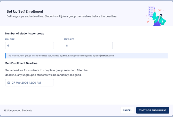 - Specify the minimum and maximum number of students allowed per group. The total count of groups will be the class size divided by the specified minimum number of students. Each group will have at least the specified minimum and at most the specified maximum number of students.