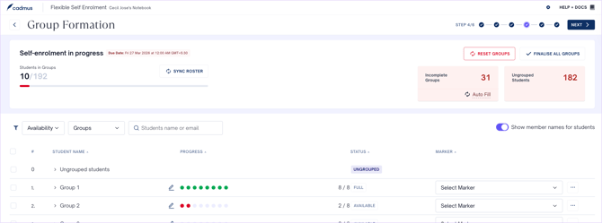 - When self-enrolment is in progress, you'll see the available groups and the status of group formation in the Progress column. Full groups (groups that have at least the minimum specified number of students) will be indicated in green, and incomplete groups will be indicated in red.