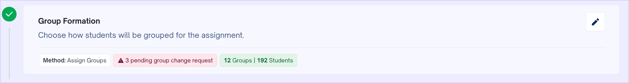 - In some cases, students may request a group change. This will be notified in the Group Formation section in the Instructions tab. You may review these requests in the Group Formation panel. Click the groups that have the tag Group Change Requested and find the same tag in front of the student names in the group. Click the checkbox next to the student name, then move them to an existing group or create a new one.