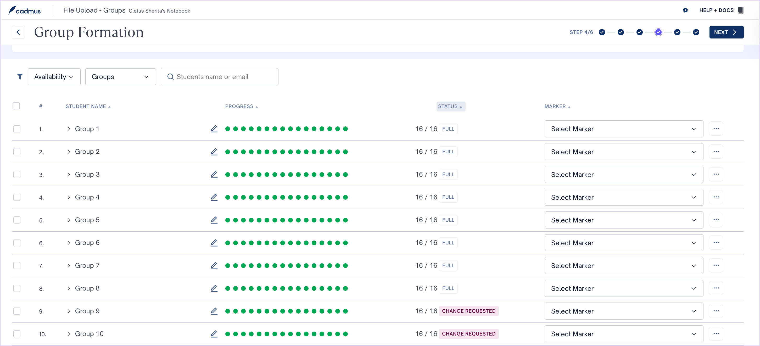 - Under the Groups section, you can use filters to view available/full/overfull groups, rename a group by clicking on the edit option next to the group name, and assign markers to groups. Click on the three dots and click on the Delete Group option to remove an existing group.