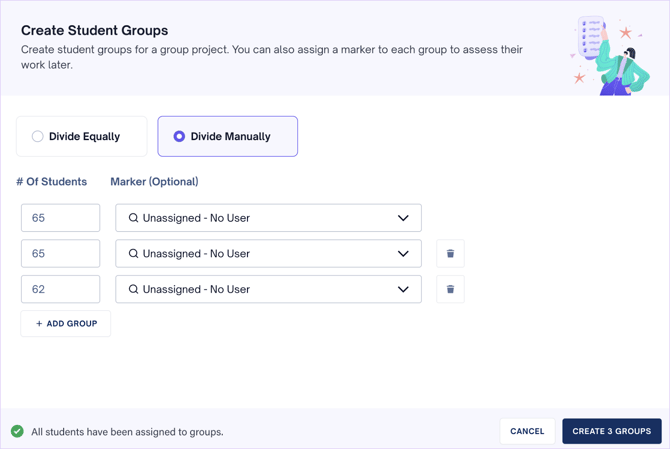 - Select the Divide Manually option, then specify the number of students you wish to add to a group and add a marker to that group.