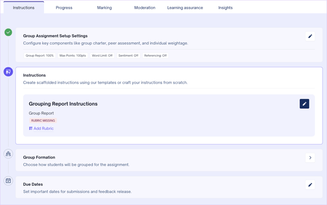 Once you have added the assessment settings and set up the instructions, you will need to divide the students into groups. You can also create student groups by clicking on Group Formation under the Instructions tab.