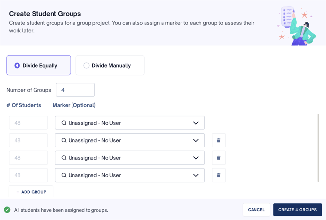 - Click the + Add Group button to add another group. This will redistribute the total number of students as per the new total number of specified groups.