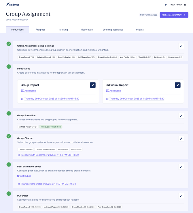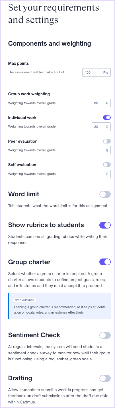 - Set the requirements and settings. Configure critical assessment-related settings such as components, weightage, word limit, marking, drafting, referencing, and generative AI. You can also select whether you wish to show rubrics to students, add a group charter, and sentiment check.