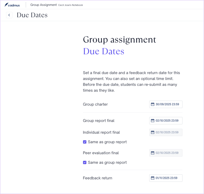 - In the last step, add the final due dates for the group charter, group report, individual report, peer evaluation, and feedback due date for the group assessment.