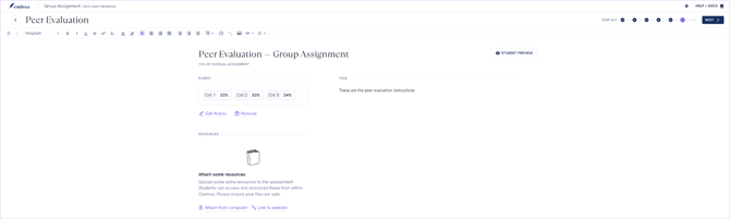 - If Peer evaluation is enabled, add instructions and a rubric for peer evaluation.