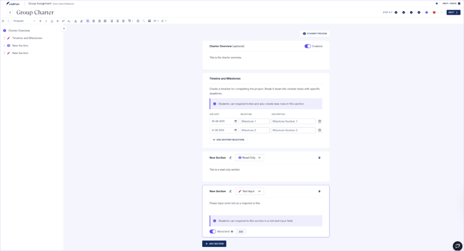 - If the Group Charter is enabled, add the charter overview, timeline, and milestones, and read-only or text input sections.