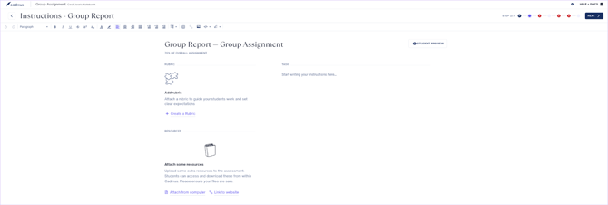 - Add the instructions for the group and individual projects, if applicable. In this step, you can add a rubric by creating a new rubric in Cadmus, attaching a pre-existing rubric or attaching additional resources.