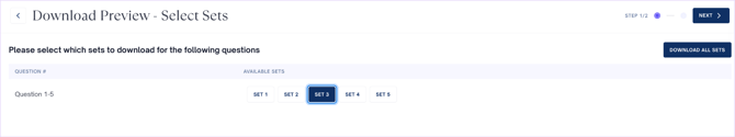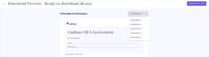 Click Download All Sets at the top-right to view the different combinations of papers according to the different question sets and download all combinations of papers as a .zip file. Use the filter dropdown to view individual combinations and the download all button to export the .zip file.