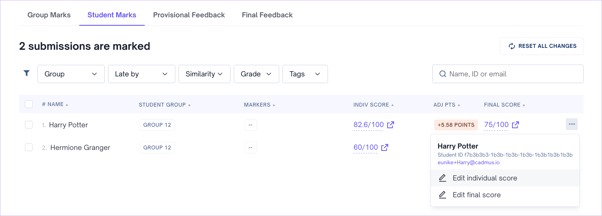 - In the Group Marks tab, you can view the final submission date, assigned marker, late status, feedback release date, and group score. Grades for a group can be edited by clicking the three dots button adjacent to the group score. Any change made to a group score will reflect for all the students in that group.