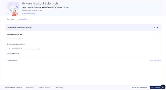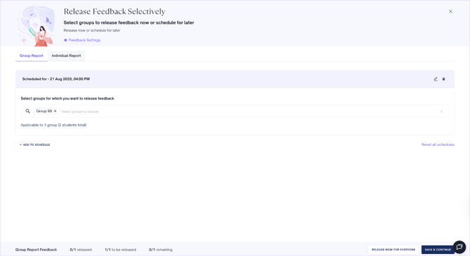 In both tabs, you can select between options: Schedule Release, to line up feedback release by adding a date and time, and Schedule Now, to instantly release feedback. Click on Add to Schedule to add more feedback release schedules. Click Reset all schedules to remove the added feedback schedules.
