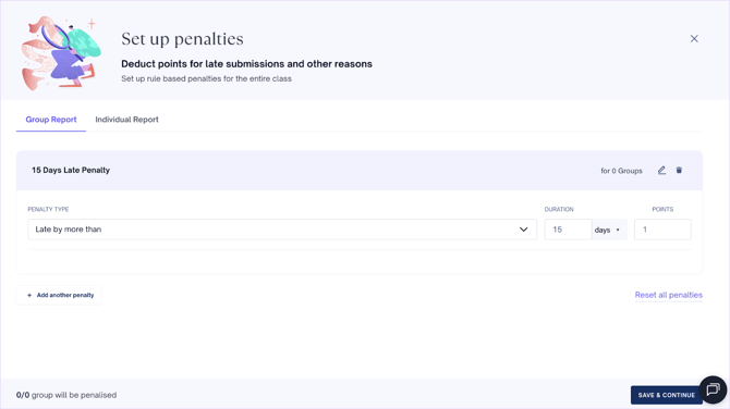 - This will take you to the Penalties panel, where you can deduct points for late submissions and/or other reasons for the entire class. You can add separate penalty conditions for the group and Individual works. Select between giving penalties as points by clicking the # icon and as a percentage of the total by clicking the % icon.