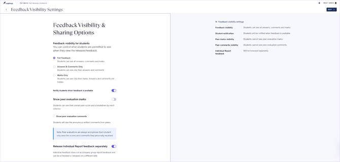 The feedback visibility settings selected will appear on the right side. Once you are satisfied with the options selected, click on the Next button.