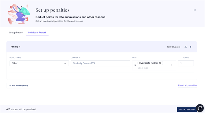 In the ‘Other’ option, along with comments and points deducted, you would’ve the option to add tags from a dropdown. Any individual submission with the mentioned tag under the Marking tab would have the specified points deducted from their score.