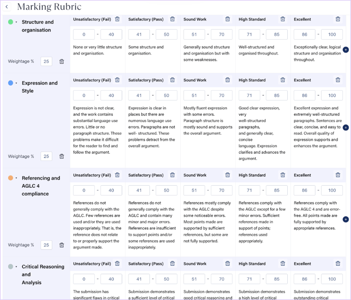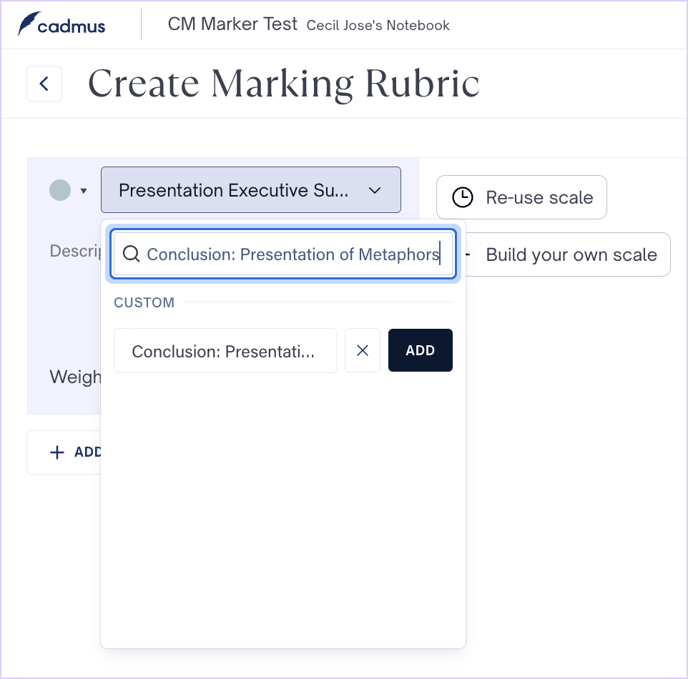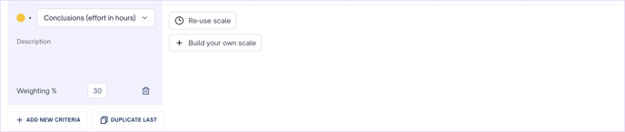 - Scales can be either reused or created from scratch. To add scales from previously used rubrics, click the Re-use scale button. To add new scales, click the Build your own scale button. Click on the Add New Criteria button to add more scales or click Duplicate Last to duplicate the criteria from the previous row. Add all criteria, scales, weighting % and descriptors to complete the rubric. You can then save the rubric.