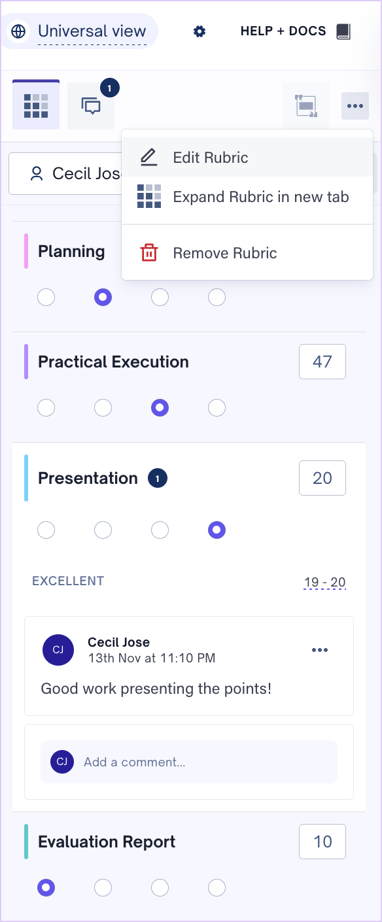 You can add comments for a specific criterion, unlink them from a criterion and also add overall comments. Click on the three dots at the top right of the panel to find options to edit or remove the rubric, and open the rubric in an expanded window. When the expanded view rubric is open, the right-hand side rubric panel will not be available. Click on the Return Rubric to Side Panel button to continue grading from the right-hand side rubric panel.