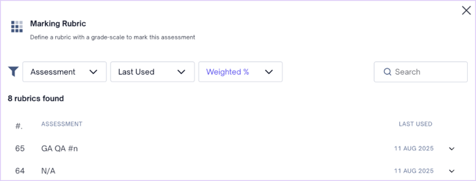 - When reusing past rubrics, search for the assessment that contains your rubric or use the date filter to find your assessment.