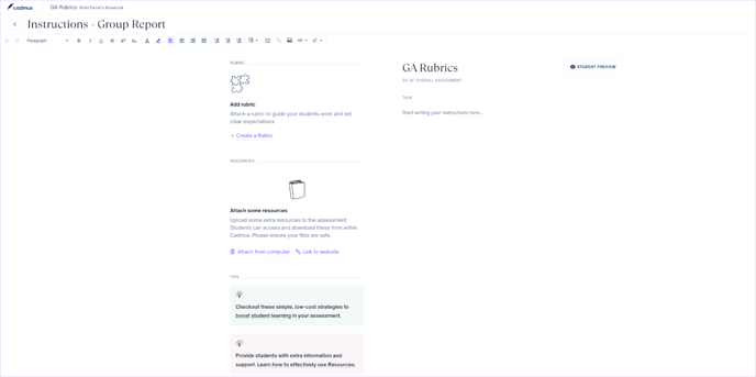 - In the Instructions tab, go to the Group Report Instructions and click on Create a Rubric.