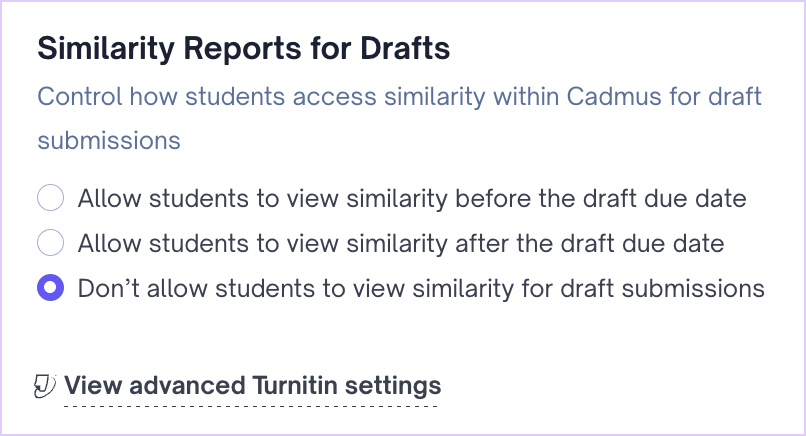 - Select your preferred Turnitin similarity settings for drafts under Similarity Reports for Drafts. Click View advanced Turnitin settings to setup additional similarity settings.