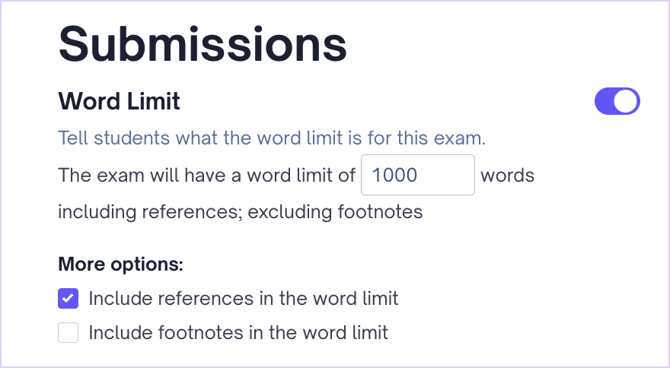 If you turn Word limit on, you can inform students of how many words are expected for the exam. You can also choose if the references or footnotes students add will be included in the word limit or not.
