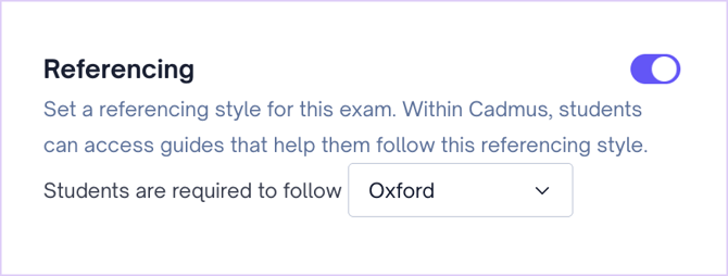 If Referencing is on, students will have a designated References section to add their bibliography or end-of-text reference list in the Cadmus Student Environment. Students will also be able to see the relevant referencing guides in Cadmus depending on the referencing style you select.