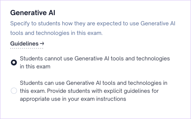 - Choose between the options to permit students to either not use or use Generative AI tools and technologies for the assessment or exam.