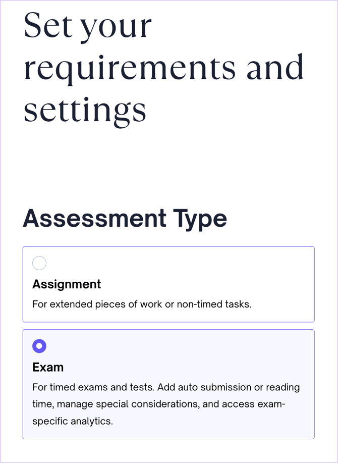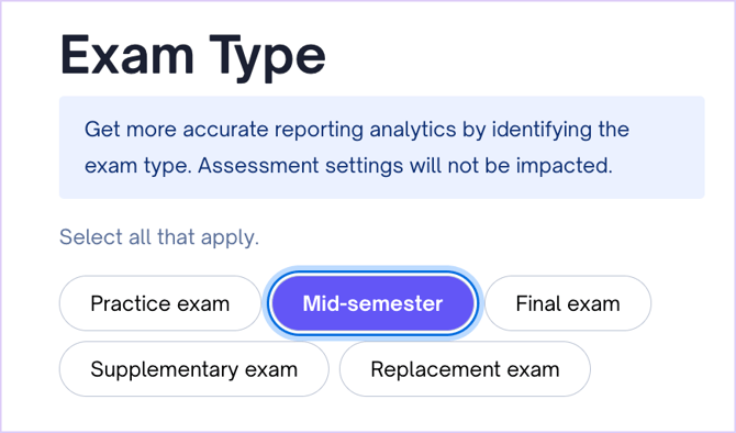 Specify what sort of exam or test you are setting up to assist with reporting and analytics. Your assessment settings will not be impacted by the exam type you select.