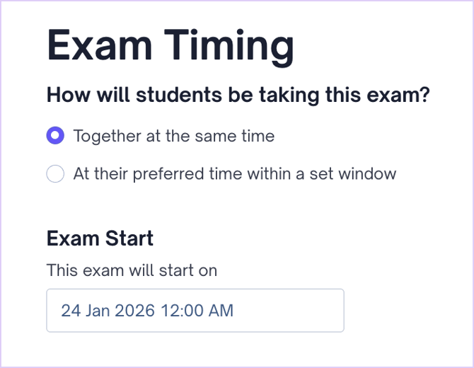 If your students are sitting the exam at the same time, we recommend selecting Together at the same time. You will then need to specify the Exam start date and time.