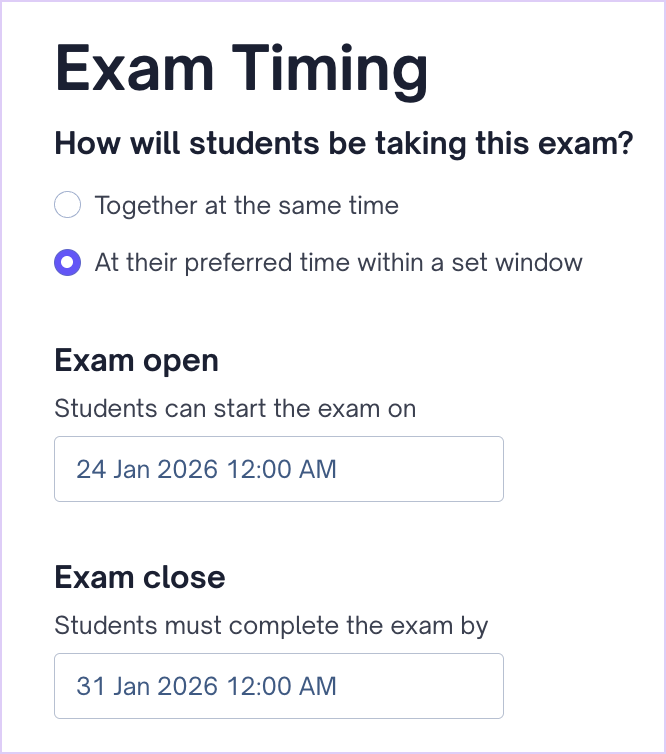 Selecting At their preferred time within a set window allows you to set an exam that is open for a window of time (e.g. 24 hours). Students can choose when to start within this window and will have a set amount of time to complete the exam (e.g. 2 hours). Specify an Exam open and Exam close date and time for exams of this format.