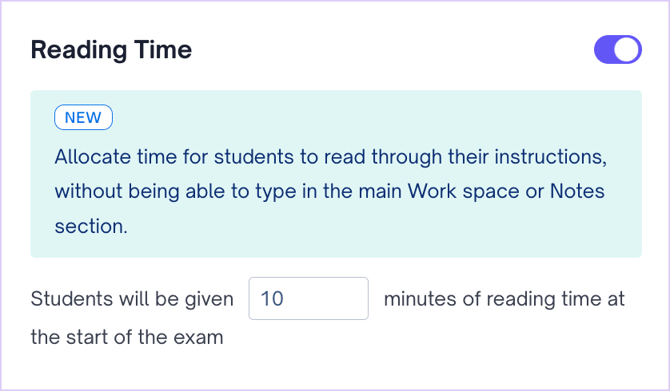 If Reading time is On, you can allocate time at the start of an exam for students to read through their instructions without being able to type in Cadmus. Simply specify the number of minutes of reading time.