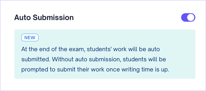 If Auto submission is on, students' work will be automatically submitted at the end of their allocated writing time.