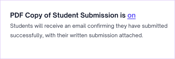 Students receive an email confirming they have submitted successfully by default. If PDF student submissions is on, students will receive a PDF copy of their submission attached to the submission confirmation email.
