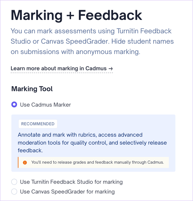 As a Canvas user, you have the option to mark Cadmus assessments in Turnitin Feedback Studio or Canvas SpeedGrader. It's important to select your preferred marking tool before releasing your assessment.