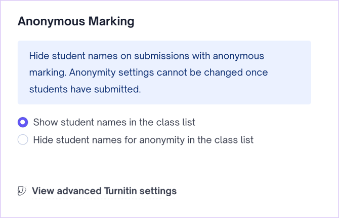 Anonymous marking allows student names to be hidden from submissions during marking. Once a submission has been made in an assessment, you'll no longer be able to change this setting.